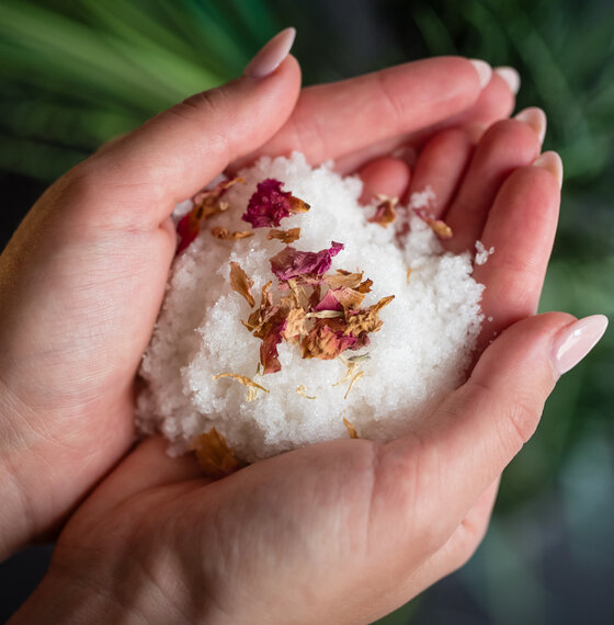 1 Salz- oder Zuckerpeeling mit ätherischen Essenzen, 1 Gesichtsmaske, 1 Bodylotion (30 ml)