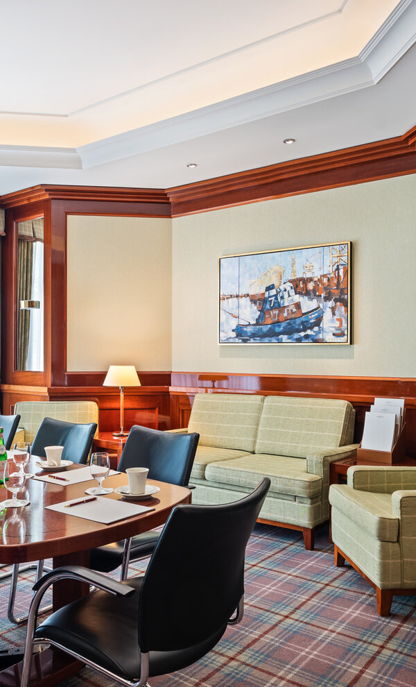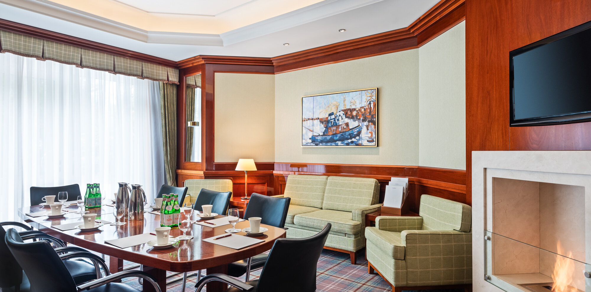 Our Kaminzimmer (lounge with a fireplace) is a quiet meeting lounge on the ground floor of the Grand Elysée Hamburg. The fireplace adds a warm and cosy touch to the meeting level, whilst the daylight and a small patio create a comfortable atmosphere. The room's twenty-five square metres are ideal for confidential or small meetings, or as a breakout space for voting purposes.