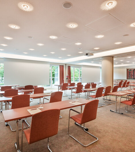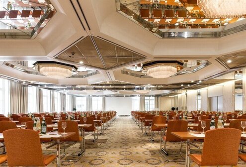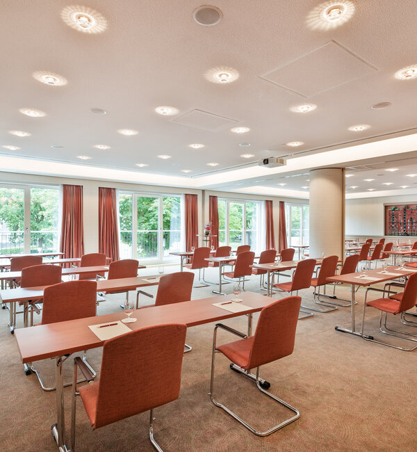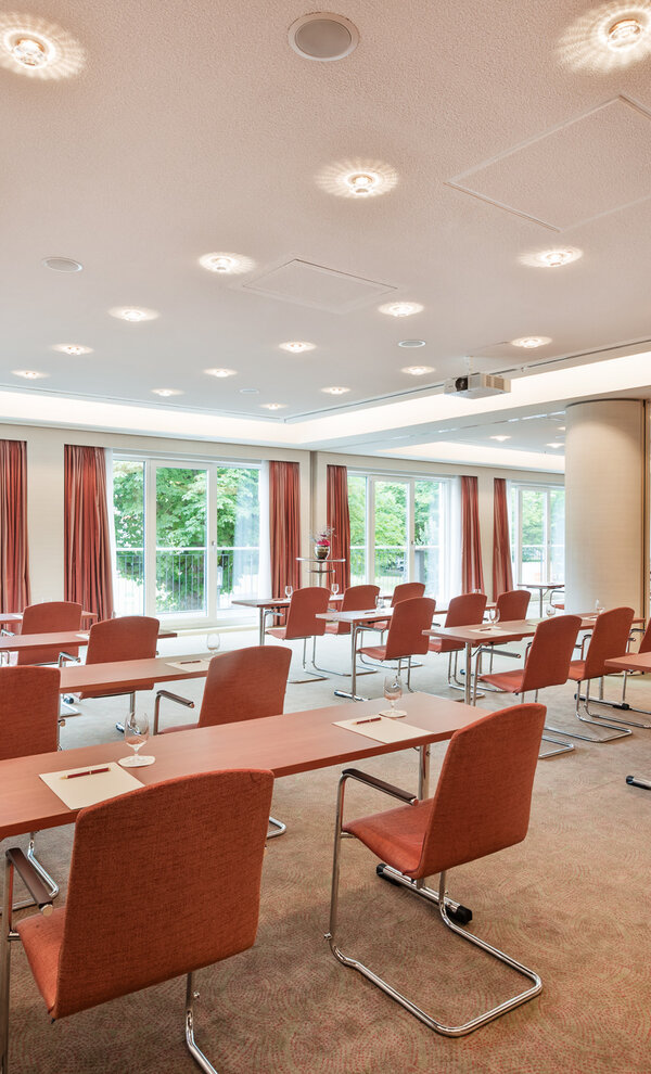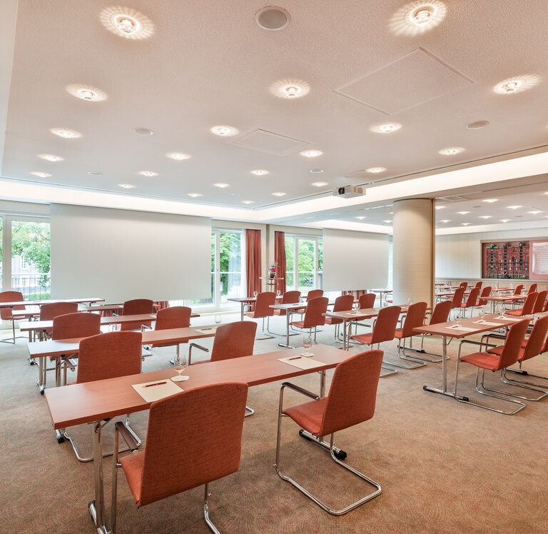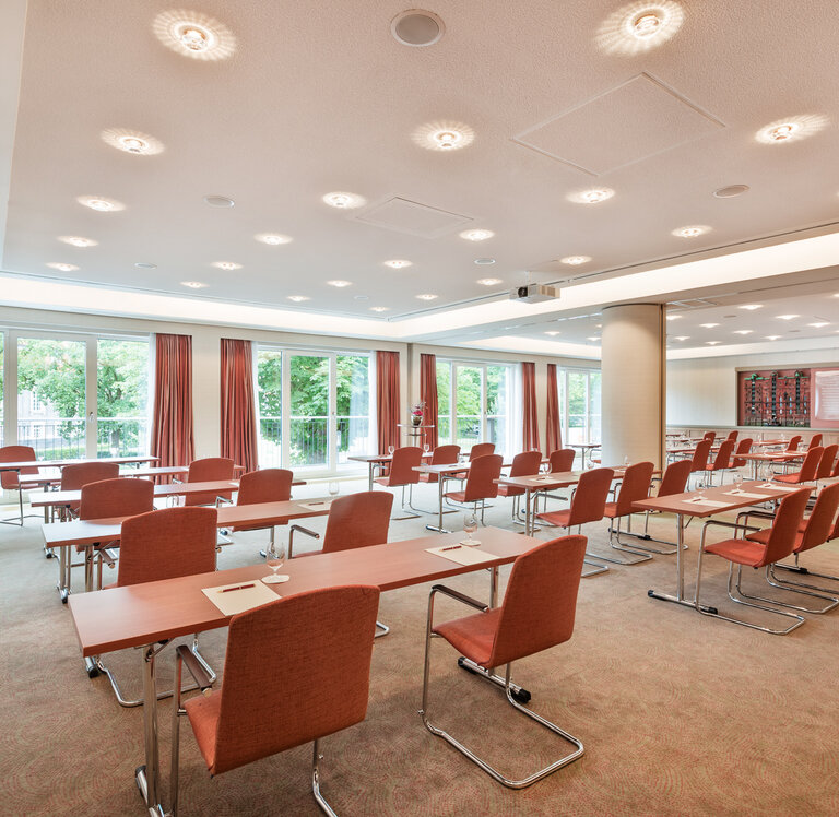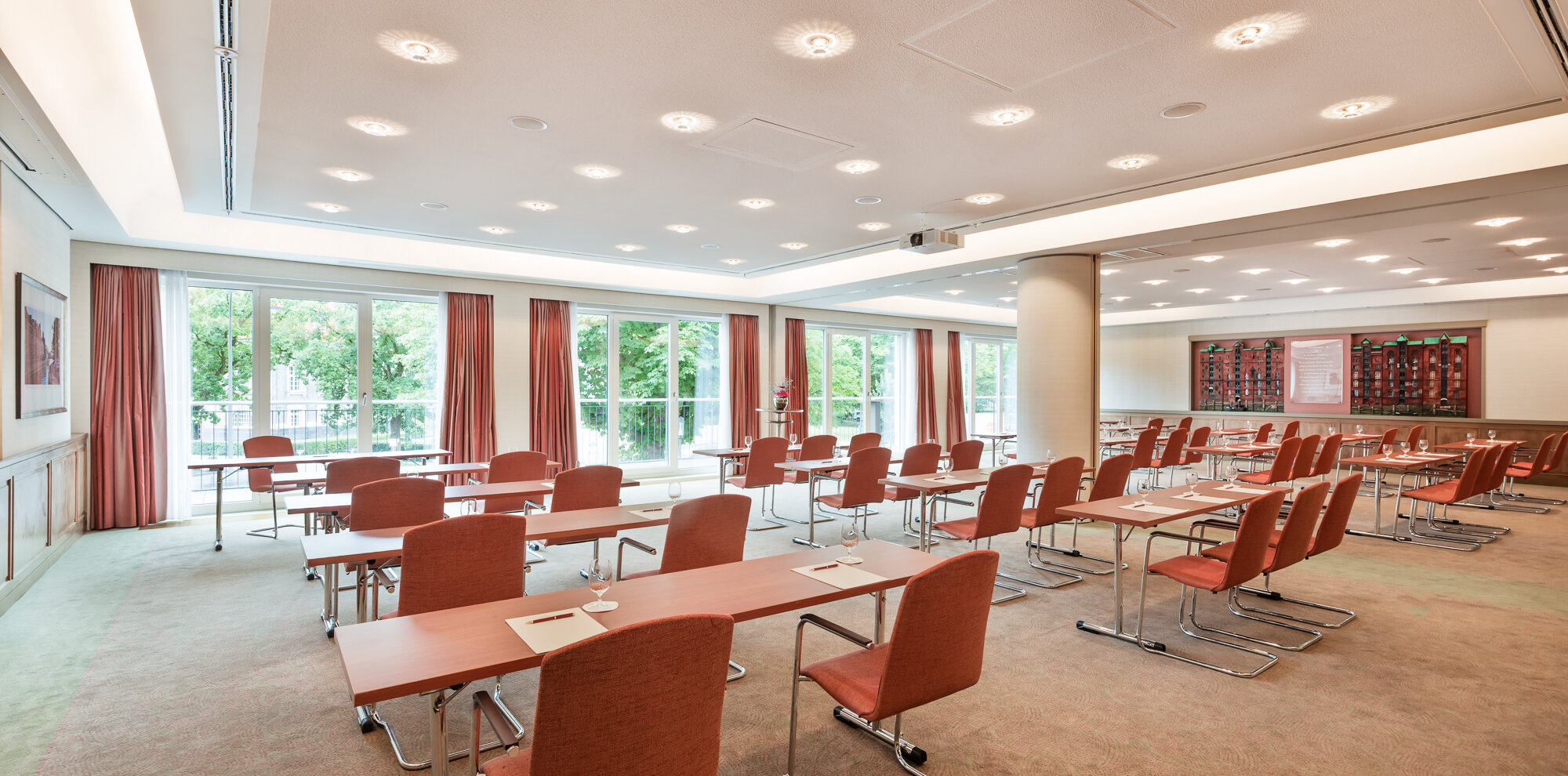 Our Speicherstadt function room is located on the first floor of the Grand Elysée Hamburg and offers one hundred and seventy square metres for workshops, receptions or conferences. Its floor to ceiling windows look out over Rothenbaumchaussee and lead onto a small balcony. Two room sections make it possible to use the room flexibly for groups of up to 140 people.