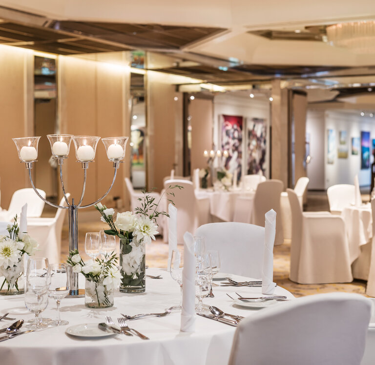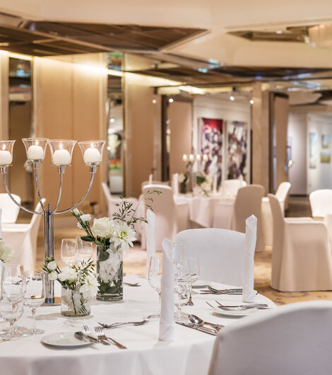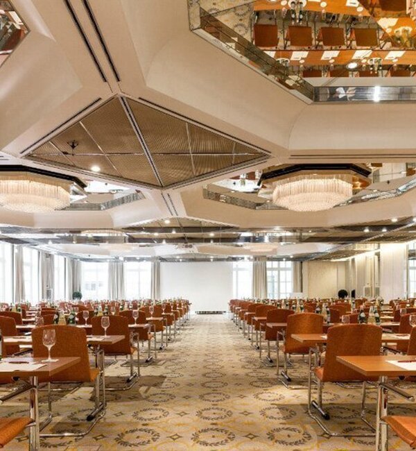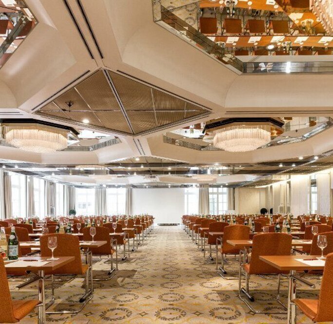 Our Spiegelsaal on the ground floor of the Grand Elysée Hamburg couples a classic charm with modern elegance. Octagonal ceiling mirrors lend an unparalleled shine to every event. A dedicated patio extends the room outdoors, and the adjacent gallery is eminently suitable for receptions or breaks. Two flexibly usable sections and daylight make the Spiegelsaal a versatile function room for all kinds of events.