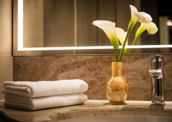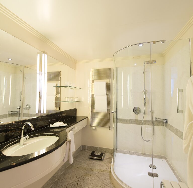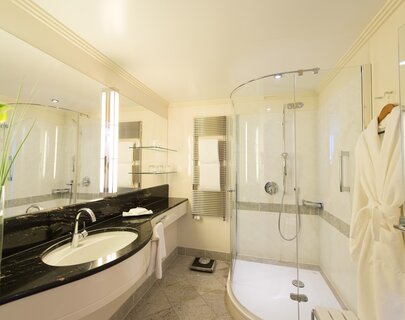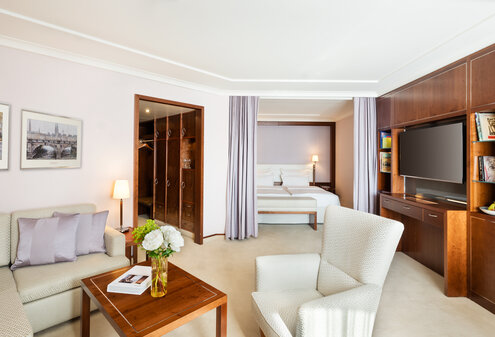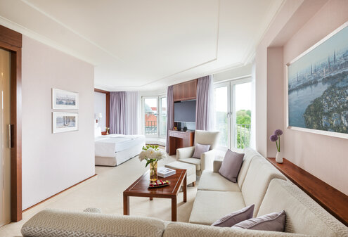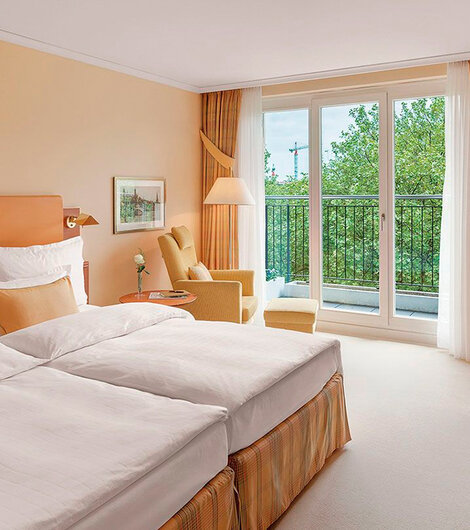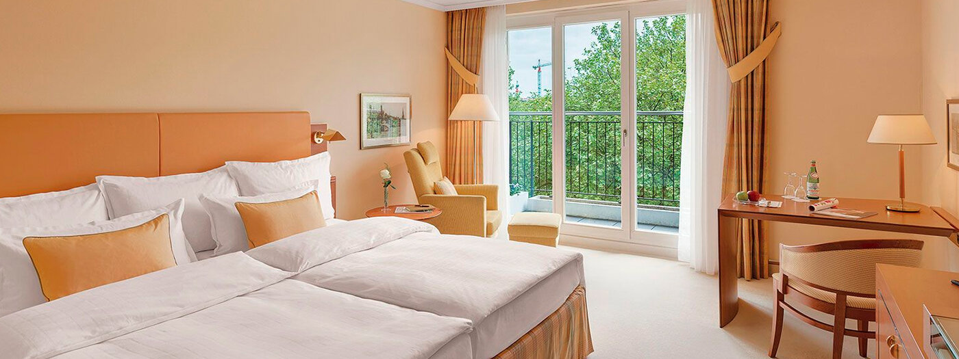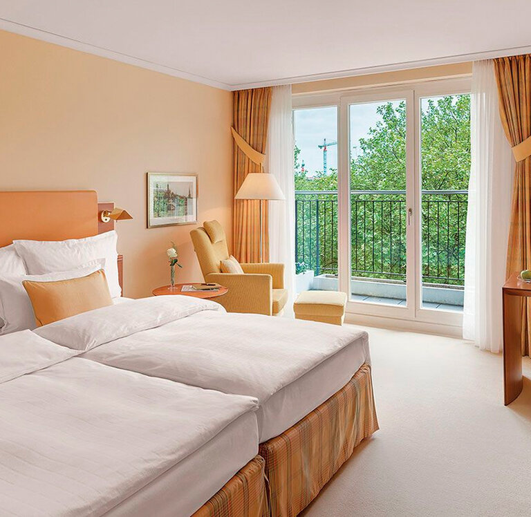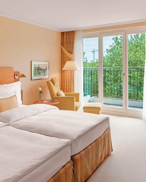 The Park-South Room overlooks the green Moorweidenpark. Open the doors of your south-facing French balcony to let the sunshine in. You can look forward to thirty-five square metres with an extra large double bed for restful nights, a desk for your important business and an armchair for you and your favourite book.