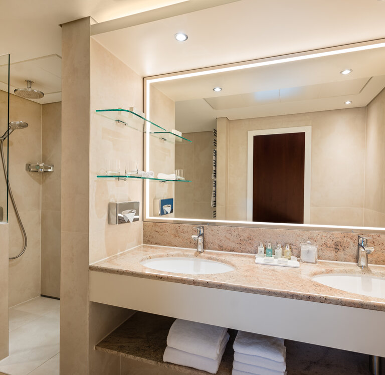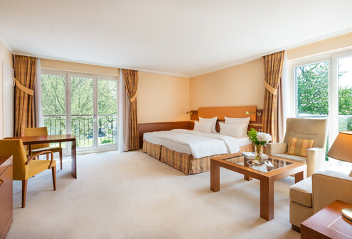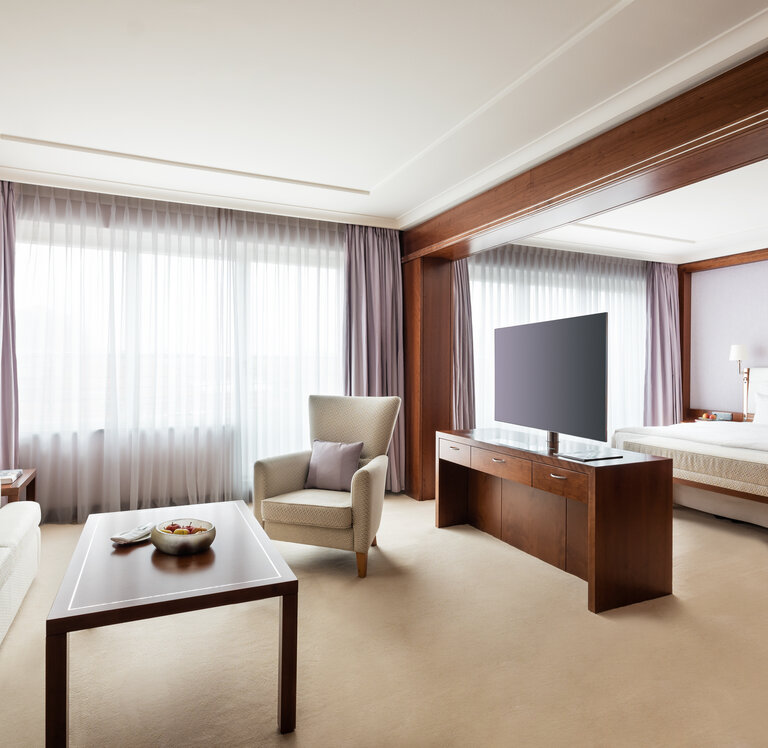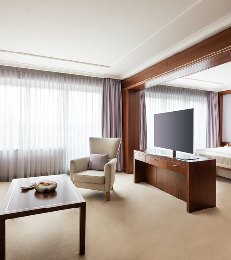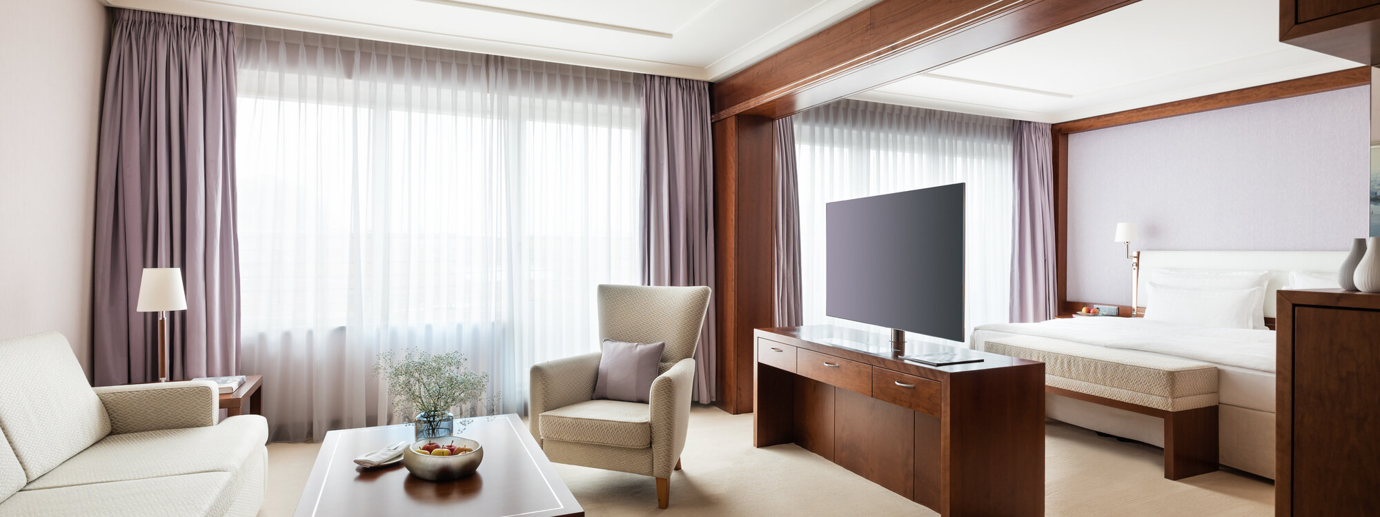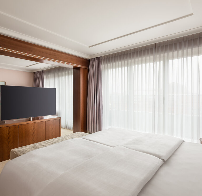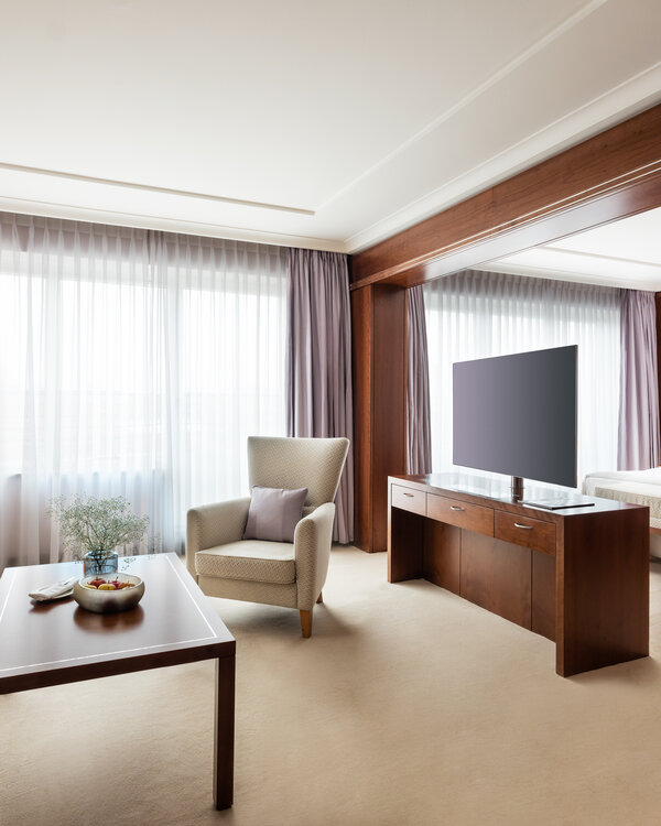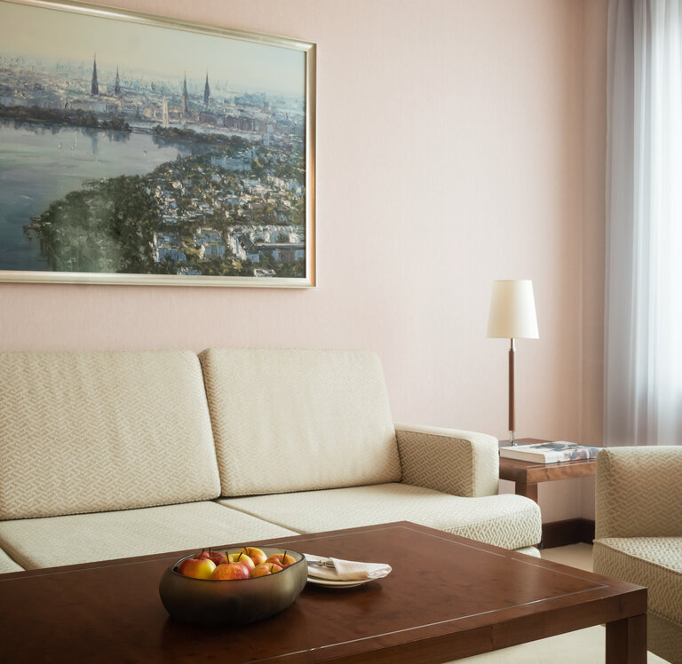 Sixty-five square metres and two rooms that invite you to stay. A living room with cosy couches to sink into and a desk for thinking. A bedroom that promises wonderful dreams. And a balcony that connects you to Hamburg's skyline.