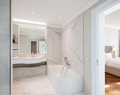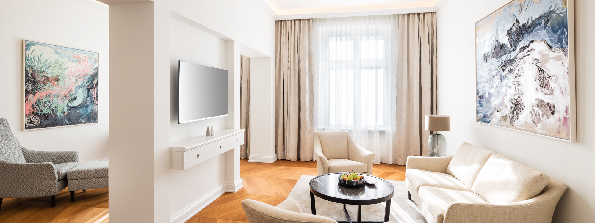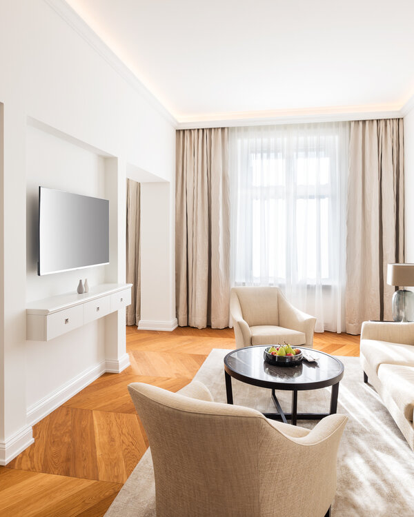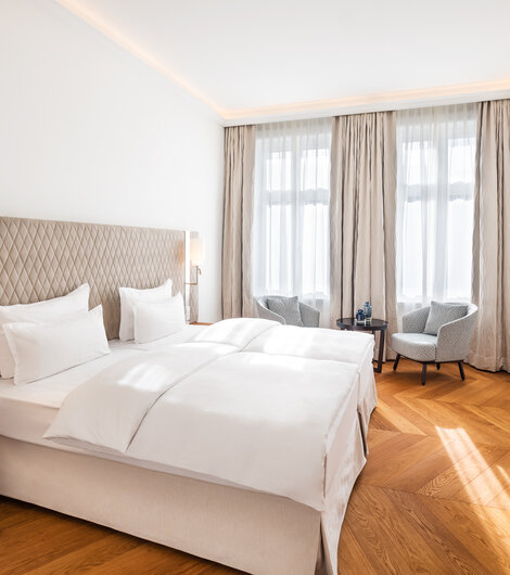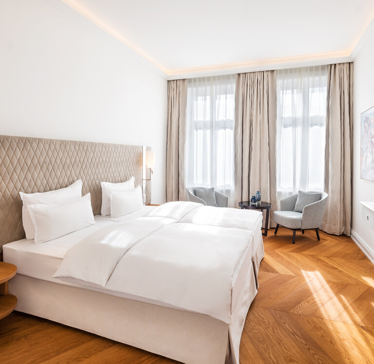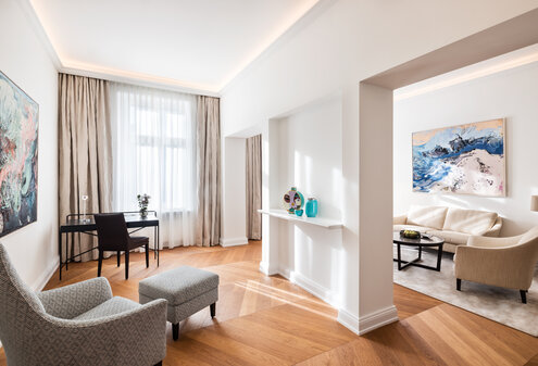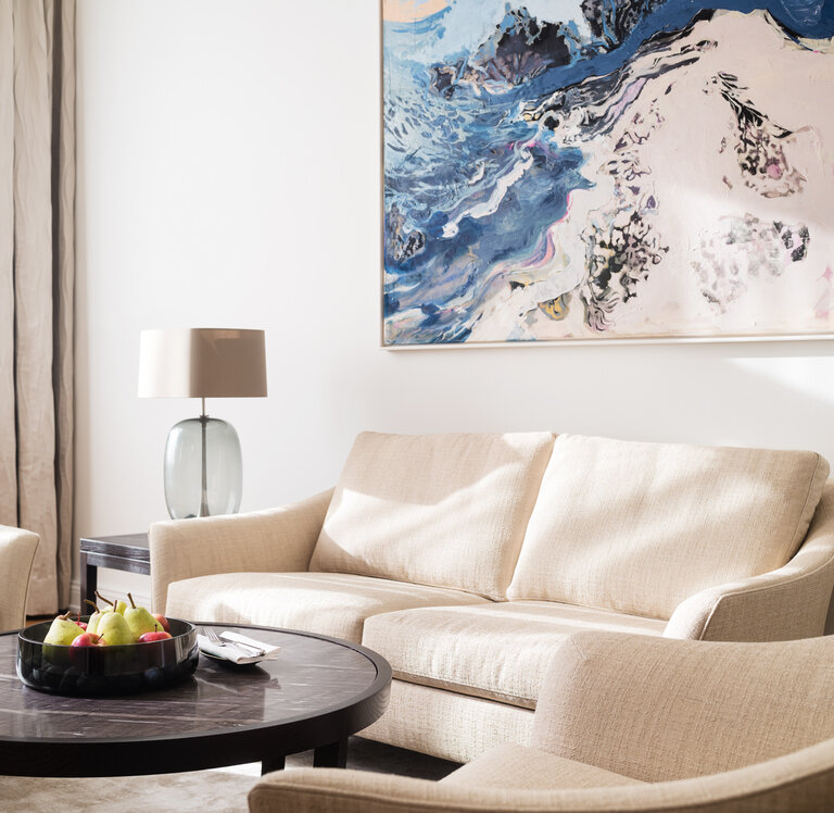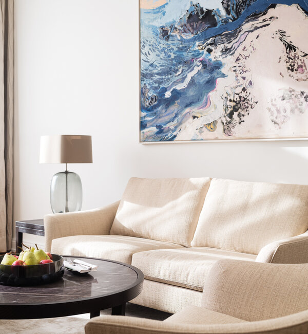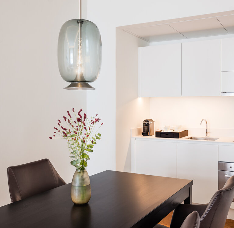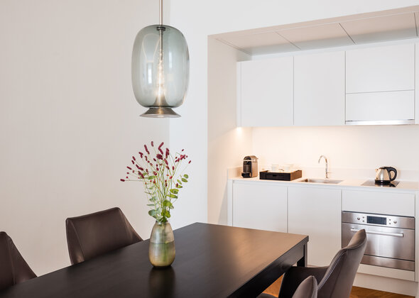 Sleeps up to two peopleEighty-five square metres to arrive in and stay. An elegantly designed dining and lounge area with a couch, a kitchenette for small gourmet treats and original art on the light-coloured walls. Extra wide beds, a walk-in shower and views across the quiet courtyard. Our Villa Suite 3 offers you a refuge in the busy metropolis by the river Elbe: for longer stays, inspiring days spent working or a special short break for two.