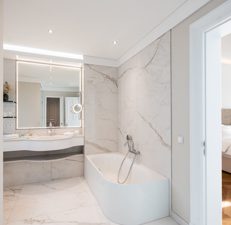 • Spacious bathroom with white marble, bathtub and walk-in rain shower