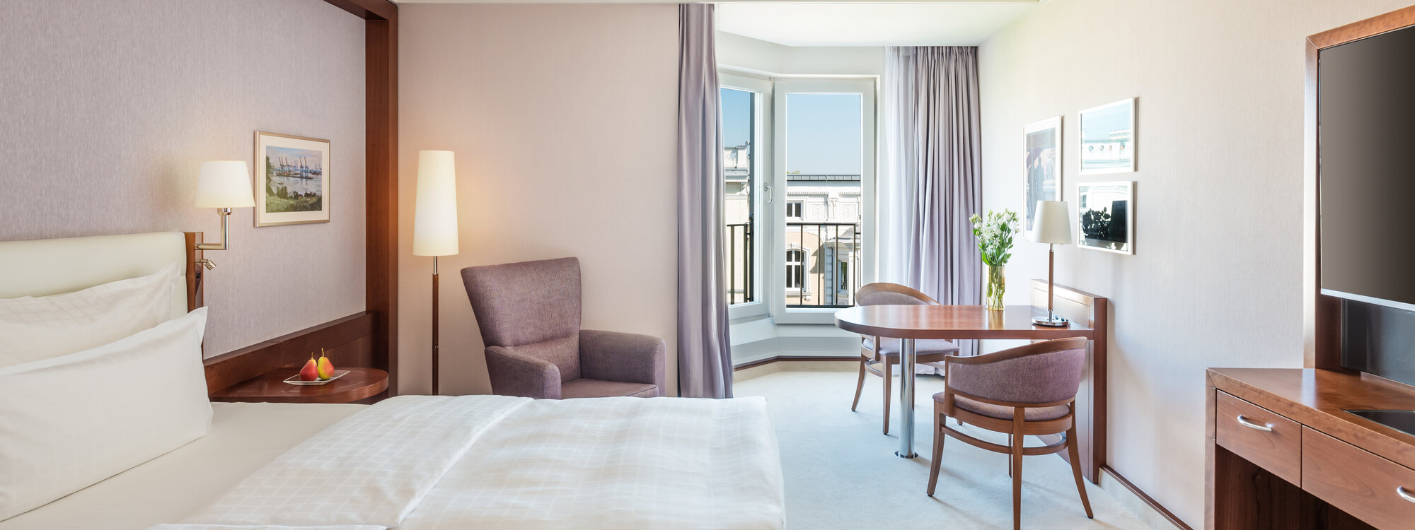 30 m² Eleganz mit Blick über die Stadt. Schallgeschützte Fenster sorgen für Ruhe, das großzügige Doppelbett für erholsame Nächte. Einige Zimmer verfügen auch über eine Badewanne.